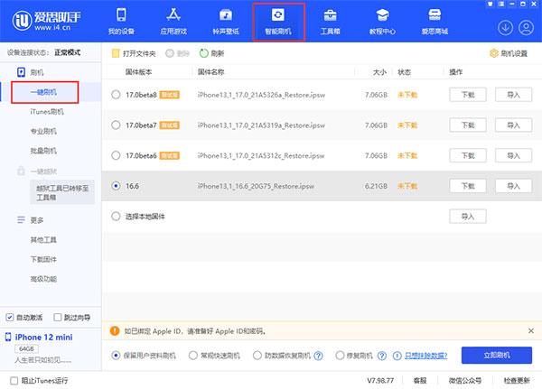 保留用户资料刷机:如果希望在刷机同时保留用户数据,请勾选此项。但由于苹果系统限制,降级操作时不可勾选,否则可能会导致刷机失败,数据丢失。