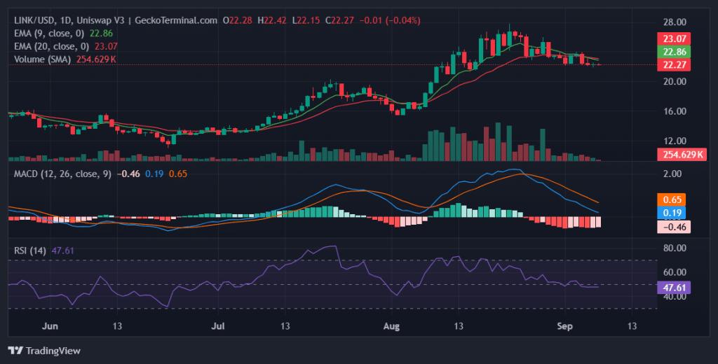 1 天图表显示,LINK 已稳定在 22.20 美元至 22.30 美元区域附近,这一水平已被证明是交易者的关键短期支点。