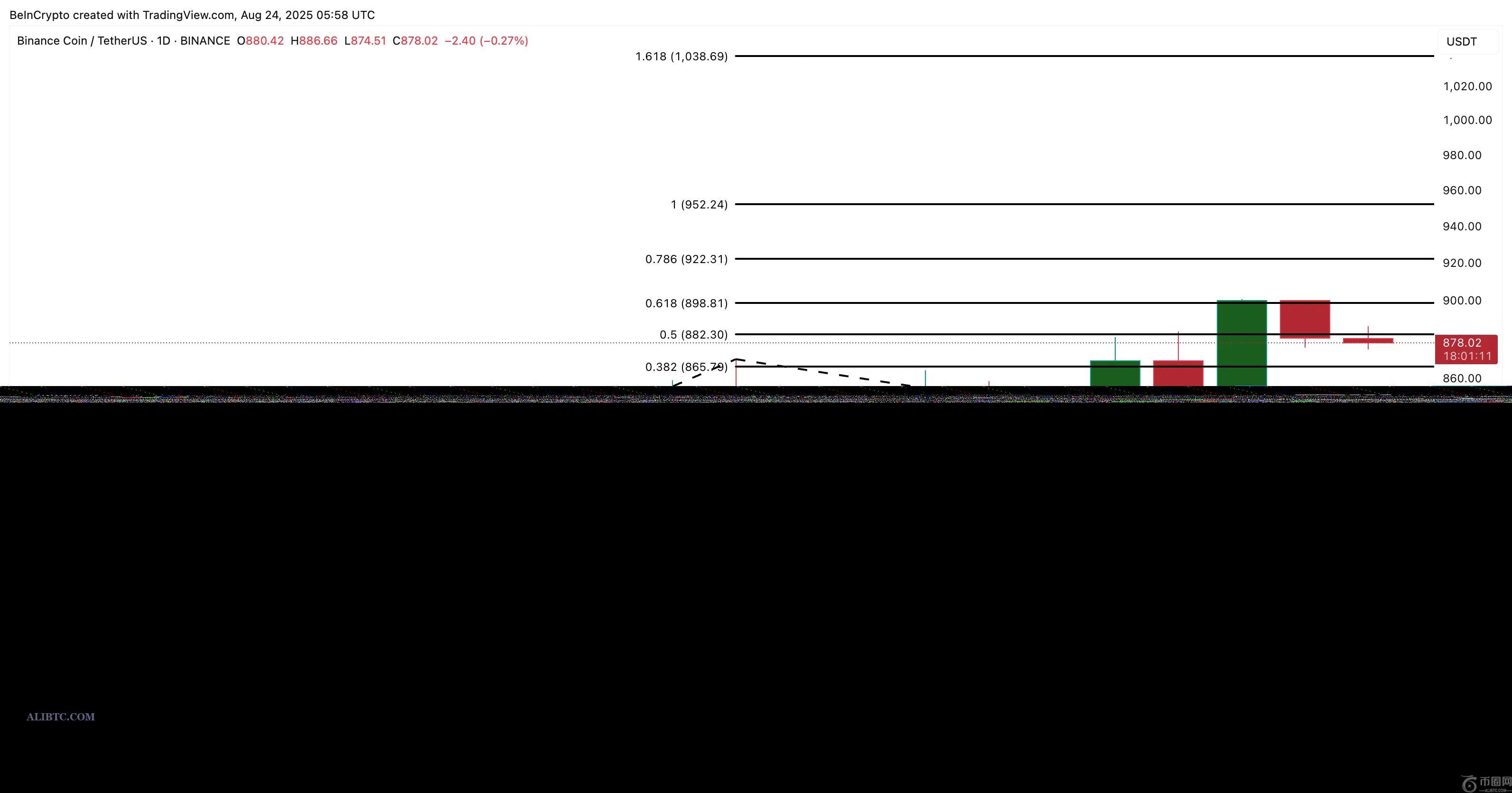 BNB 正在测试可能决定其下一步走势的关键阻力位。该代币近期从 898 美元回落,该水平与 0.618 斐波那契扩展位相符,这通常被视为上升趋势中最强的阻力位。BNB价格目前位于另一个关键阻力位 882 美元下方。