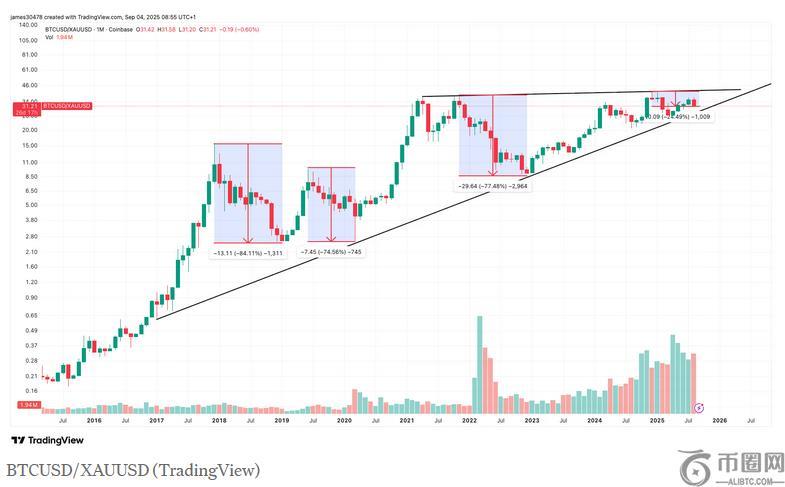 技术的 分析图显示,BTC/XAU 比率一直在一个大型上升三角形内盘整,这是自 2017 年以来形成的看涨延续形态。该比率在 2024 年底的水平与 2021 年底的峰值相似,但此后已回调约 25%。目前,该结构表明,第四季度末或明年年初可能出现突破。