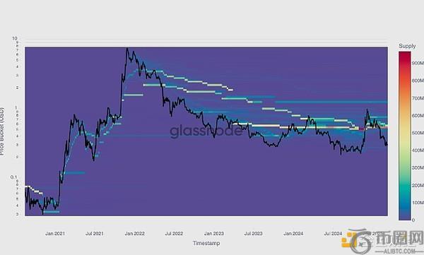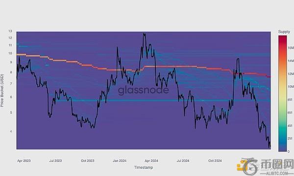 暖色(红色/黄色)表示给定价格范围内供应集中度较高,而冷色(蓝色/绿色)则意味着供应量较低。