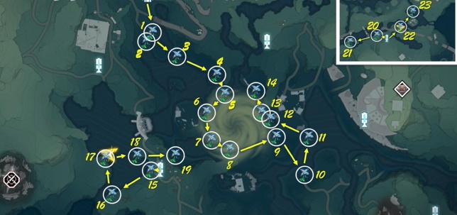 1、大家跟着下图小编带来的采集路线可以在怨鸟泽周围采集23朵鸢尾花哦;