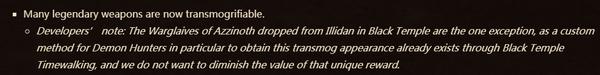在之前的PTR中,玩家幻化橙武只有“是否能使用该武器”这一条限制,也就意味着战士可以幻化瓦兰奈尔(治疗单手锤),猎人可以幻化埃提耶什(猎人并不能得到该武器)等。但是在最新的补丁中,有了如下限制: