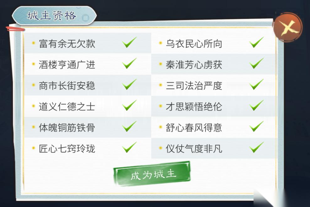 当属性、名望达到要求之后,即可前往南都总览,考察城主资格,若各项指数皆已达标,则能晋升城主,在南都城内尊享荣耀!