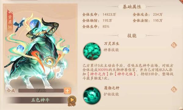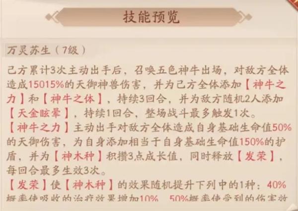 己方累计3次主动出手后,召唤五色神牛出场,对敌方全体造成15015%的天御神兽伤害,并为己方全体添加【神牛之力】和【神牛之体】,持续3回合,并为敌方随机2人添加【天金眩晕】,持续1回合,整场战斗最多触发1次。【神牛之力】主动出手对敌方全体造成自身基础生命值50%的天御伤害,为自身添加相当于自身基础生命值150%的护盾,并为【神木种】积攒3点成长值,同时释放【发荣】每回合最多生效3次。