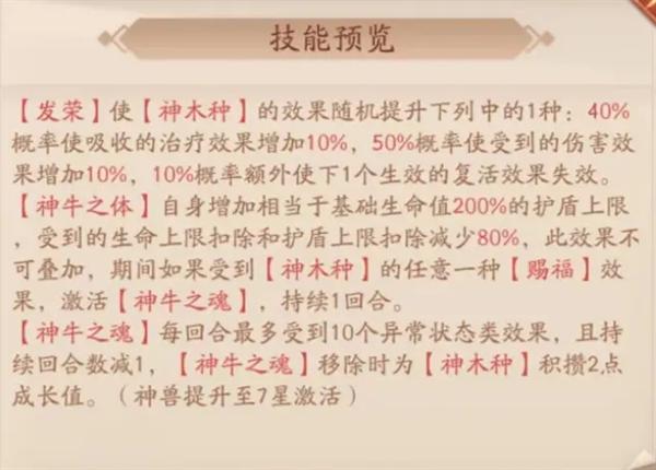 【发荣】使【神木种】的效果随机提升下列中的1种:40%概率使吸收的治疗效果增加10%,50%概率使受到的伤害效果增加10%,10%概率额外使下1个生效的复活效果失效。【神牛之体】自身增加相当于基础生命值200%的护盾上限受到的生命上限扣除和护盾上限扣除减少80%,此效果不可叠加,期间如果受到【神木种】的任意一种【赐福】效果,激活【神牛之魂】,持续1回合。