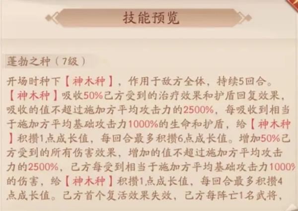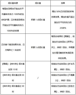 开场时种下【神木种】,作用于敌方全体,持续5回合。【神木种】吸收50%己方受到的治疗效果和护盾回复效果吸收的值不超过施加方平均攻击2500%,每吸收到相当于施加方平均基础攻击力1000%的生命和护盾,给【神木种】积攒1点成长值,每回合最多积攒6点成长值。增加50%己方受到的所有伤害效果,增加的值不超过施加方平均攻击力的2500%,己方每受到相当于施加方平均基础攻击力1000%的伤害。