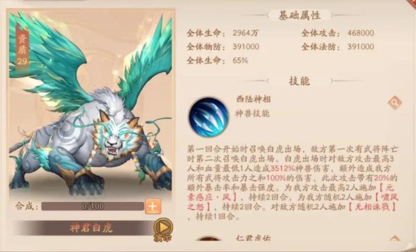 神兽增益:生命14823万、攻击234万、物防195万、法防195万、生命85%