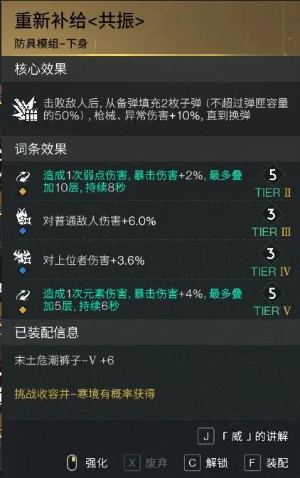 可以看到,一个模组就能提供40%的爆伤,加成非常高。共振模组为根源之战产出,产出位置为裤子和手套,如果你有和图中一模一样的两个暴击涌动和暴击强化,那你的大白鲨基本就毕业了。