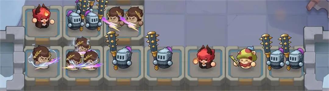 蘑菇头在该阵容中主要是前期快速累积经济。与蘑菇头相比,法师、骑士攻击距离较短,蘑菇头可以弥补该空缺,同时针对淤泥怪。