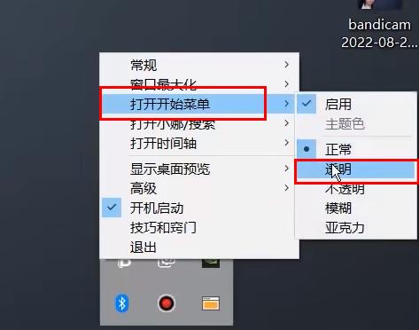 3、右击右下角的软件图标,选择选项列表中的"打开开始菜单",再点击其中的"透明",将其勾选上。