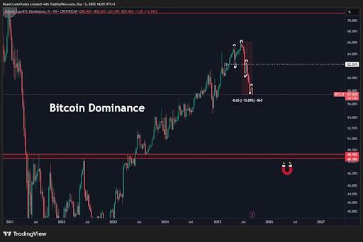在 X 中邮政Daan Crypto Trades 的全职加密货币交易员和投资者一直在观察加密货币领域的一个显著趋势。比特币(BTC.D)的主导地位仍在下降,这表明目前的表现优于市场领导者。