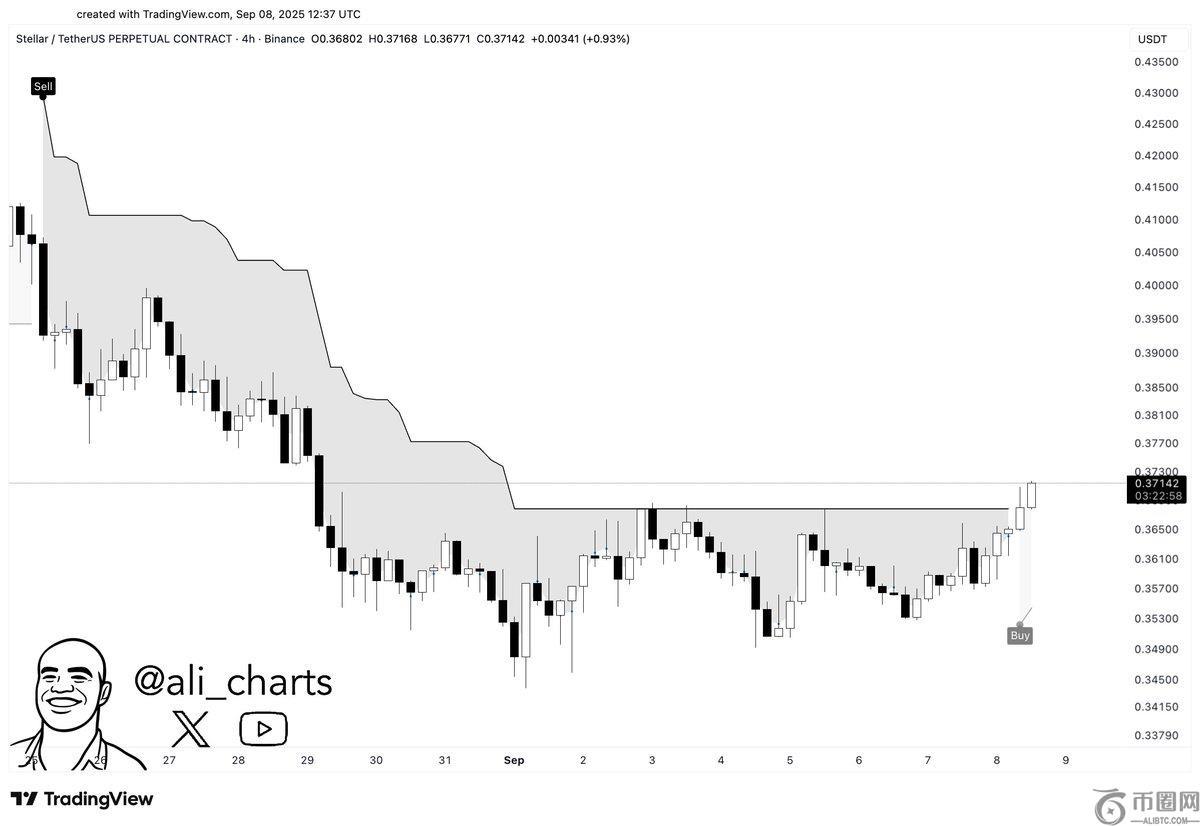 该交易员还说点对点支付项目 Stellar(星形移动模块) 根据超级趋势指标 (SuperTrend indicator) 突然闪烁看涨信号,该指标用于技术分析以确定市场方向和潜在的进入或退出点。