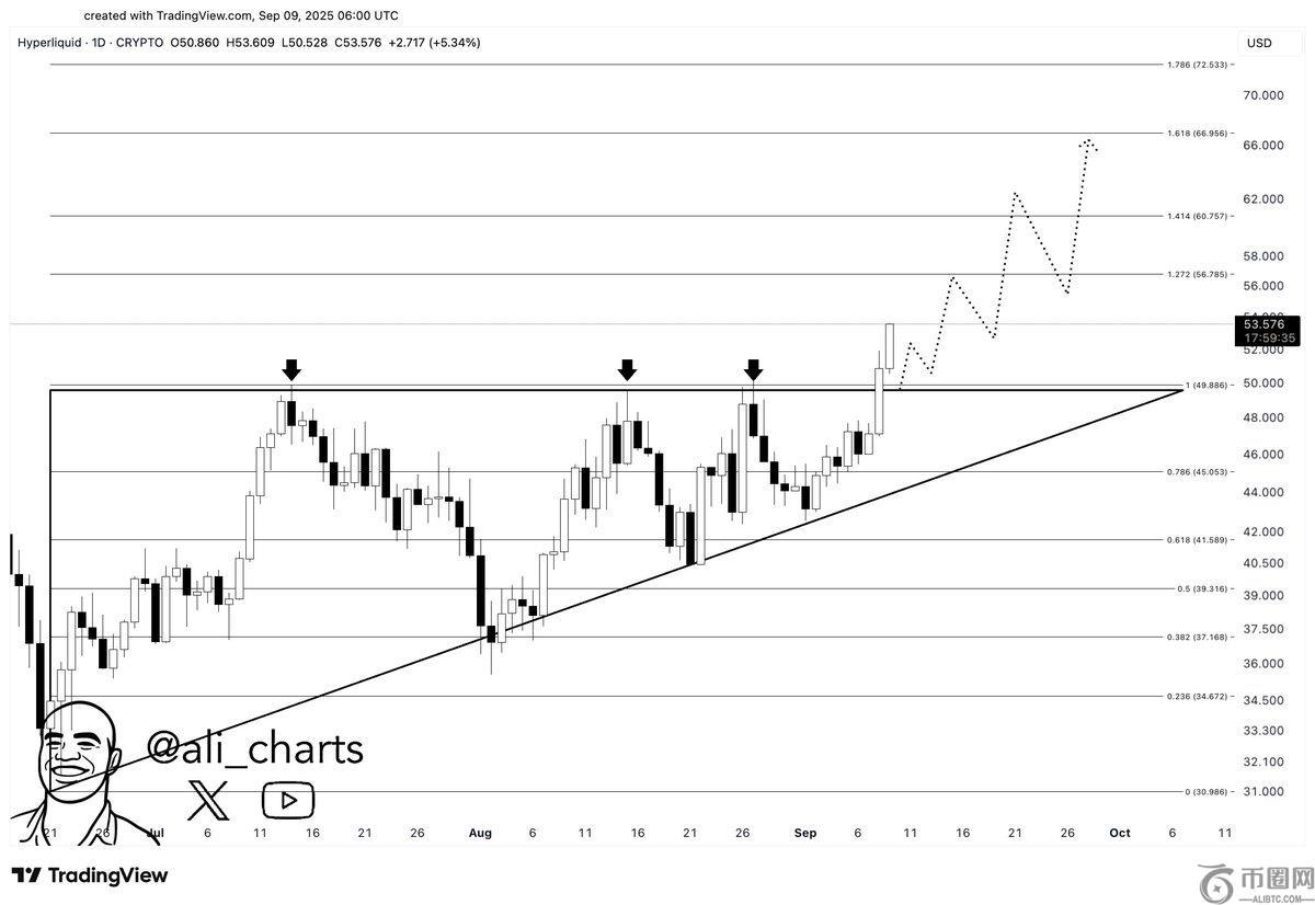 接下来,交易员说去中心化永续合约交易所 Hyperliquid 的原生代币(炒作) 在突破日线图上的上升三角形形态后,其价格可能较当前价值上涨 28% 以上。