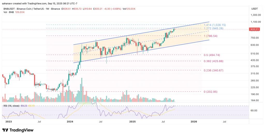 币安币的强劲价格走势助力其价格上涨,创下 945 美元左右的新高,为突破 4 位数里程碑扫清了障碍