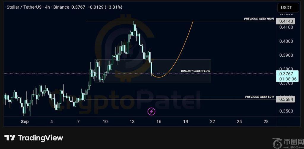 加密货币分析师 Crypto Patel (@CryptoPatel)共享X 于 9 月 15 日表示:“需求区域已测试——XLM 多头蓄势待发。为何如此布局?价格回调至看涨的订单流区域 → 需求区域正在发挥作用。预计在当前支撑位附近将出现强劲阻力。上周高点 0.4143 起到了流动性磁铁的作用。4H 市场结构依然看涨,支撑上行延续。”