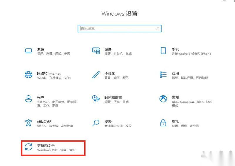 2、在Windows设置界面选择更新和安全选项;