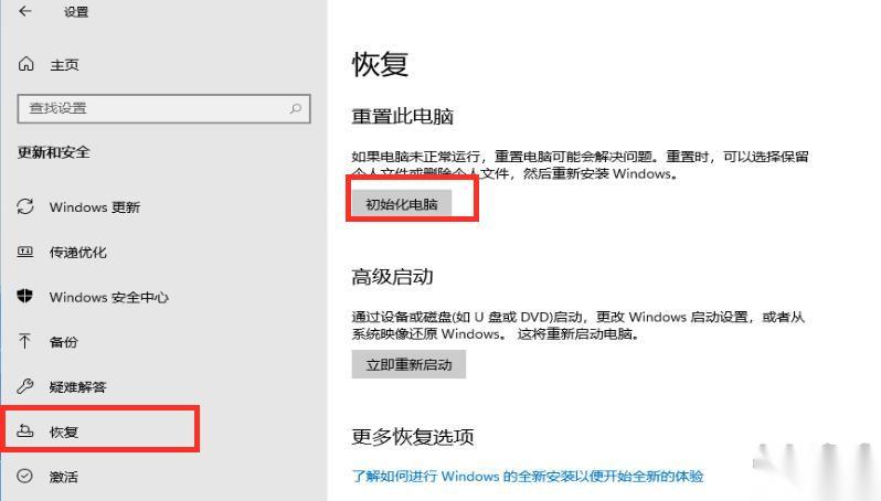 3、点击左边的【恢复】选项之后,在右侧就可以看到重置此电脑的选项啦,点击初始化电脑;