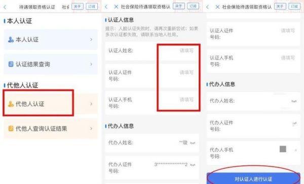 为他人认证的,选择“代他人认证”,添加人员信息后,核对代办人信息并选择“对认证人进行认证”,进行刷脸认证。(注意:点击“对认证人进行认证”后,代办人无需刷脸,对需要认证的人进行人脸识别即可。)