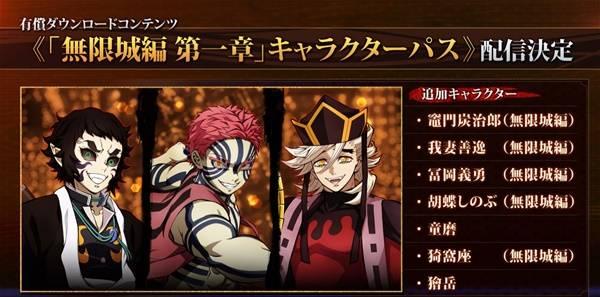 已追加角色依次为:灶门炭治郎(无限城篇)、我妻善逸(无限城篇)、富冈义勇(无限城篇)、蝴蝶忍(无限城篇)、童磨、猗窝座(无限城篇)、狯岳。