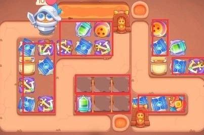 3、将右上角这个区域全部清完,然后放置保龄球向左侧开图,下方的双菱塔向下开图。