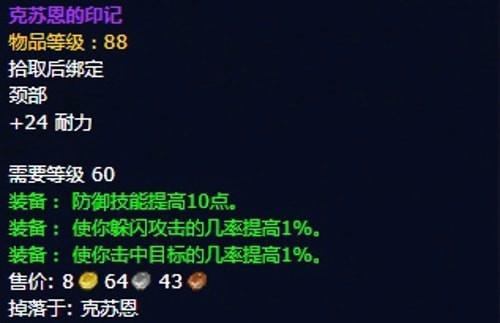 装备属性:+24耐力,装备效果 防御技能提高10点,使你躲闪攻击的几率提高1%,使你击中目标的几率提高1%。