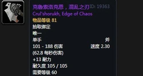 7、克鲁索洛克恩混乱之刃(兽人):单手斧,黑翼之巢副本奈法利安掉落,推荐附魔十字军。