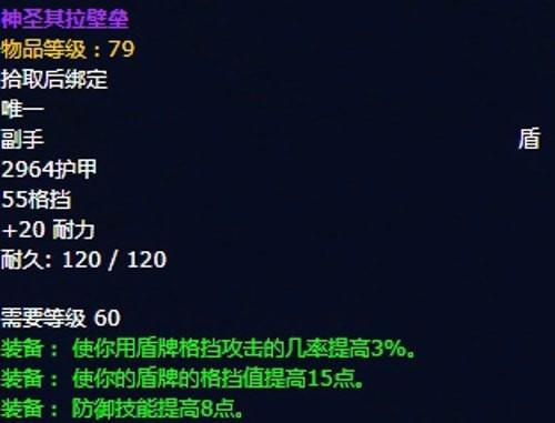 装备属性:无基础属性,装备效果使你用盾牌格挡攻击的几率提高5%,使你的盾牌的格挡值提高24点,防御技能提高13点。