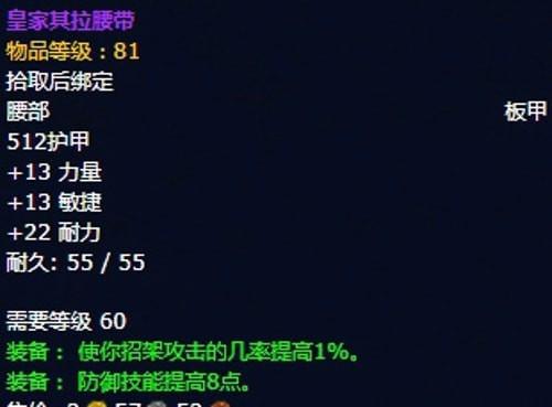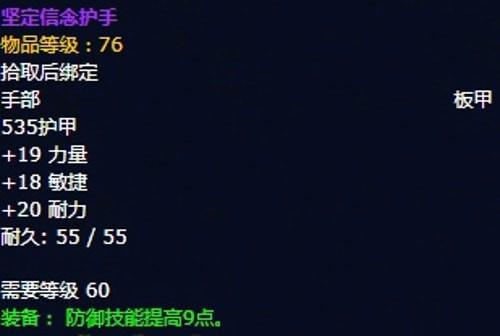 装备属性:650护甲,+11力量,+30耐力,装备效果 防御技能提高9点,使你躲闪攻击的几率提高1%。