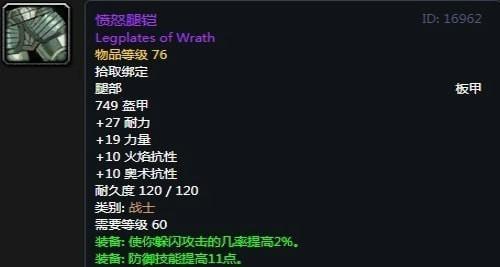 13、愤怒腿铠:腿部,熔火之心拉格纳罗斯掉落,推荐附魔力量的证明。