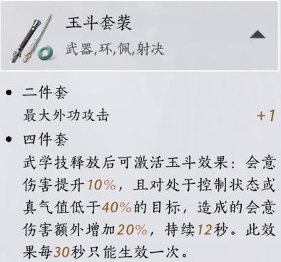 玉斗的配套防具套装,增加护盾时长,在真气高于85%或套盾时受到气血伤害降低20%适配无名剑法和嗟夫刀法。